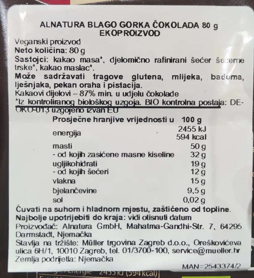 Sastojci: kakao masa, djelomično rafinirani šećer šećerne trske, kakao maslac.