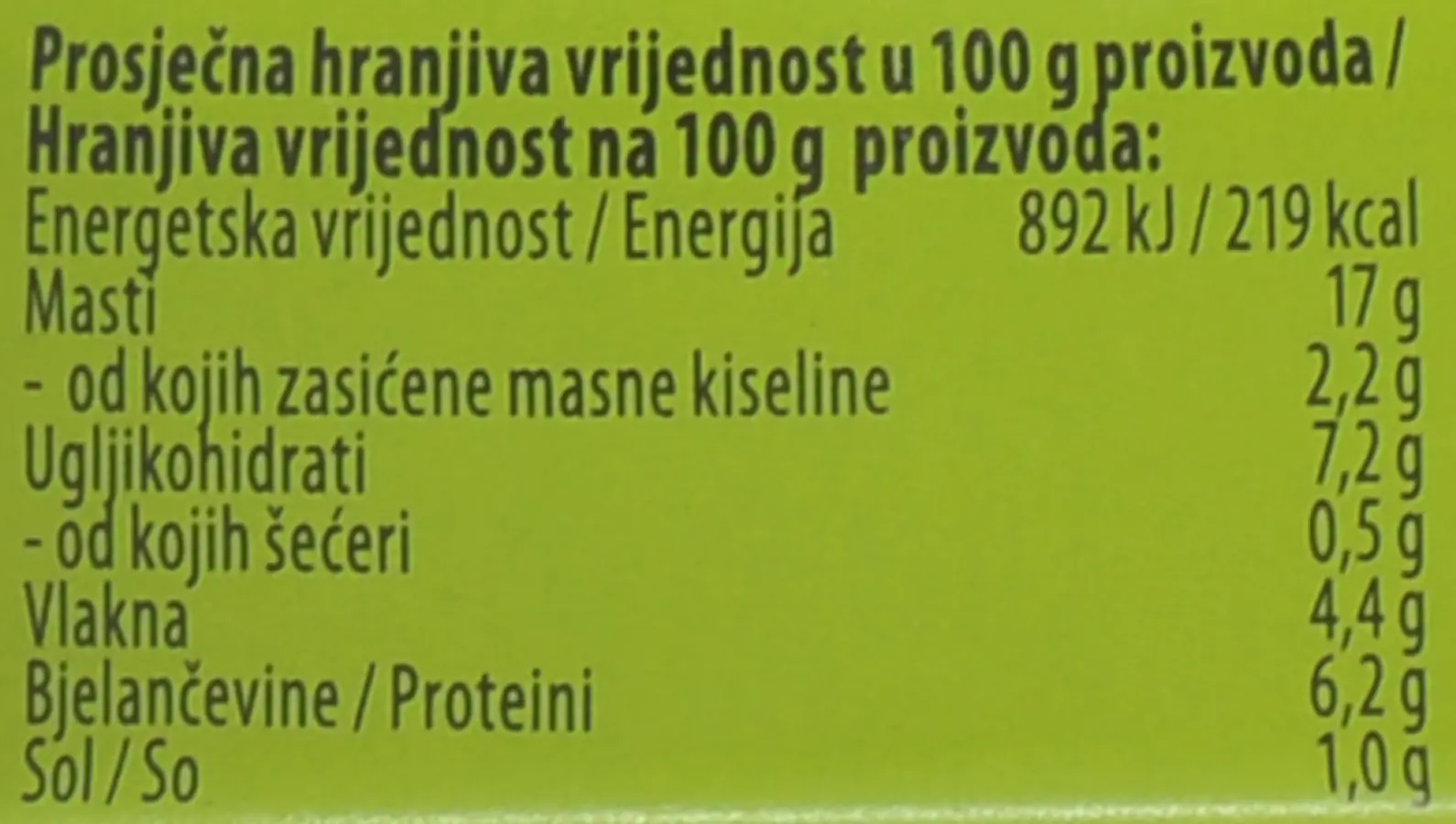 Kuhani slanutak 42 %, voda, biljno ulje (suncokretovo, repičino i sojino u promjenjivim udjelima), tahini (pasta od sezama) 7 %, ekstra djevičansko maslinovo ulje, sjeme sezama, koncentrat limunovog soka, kuhinjska sol, češnjak, bijeli papar.