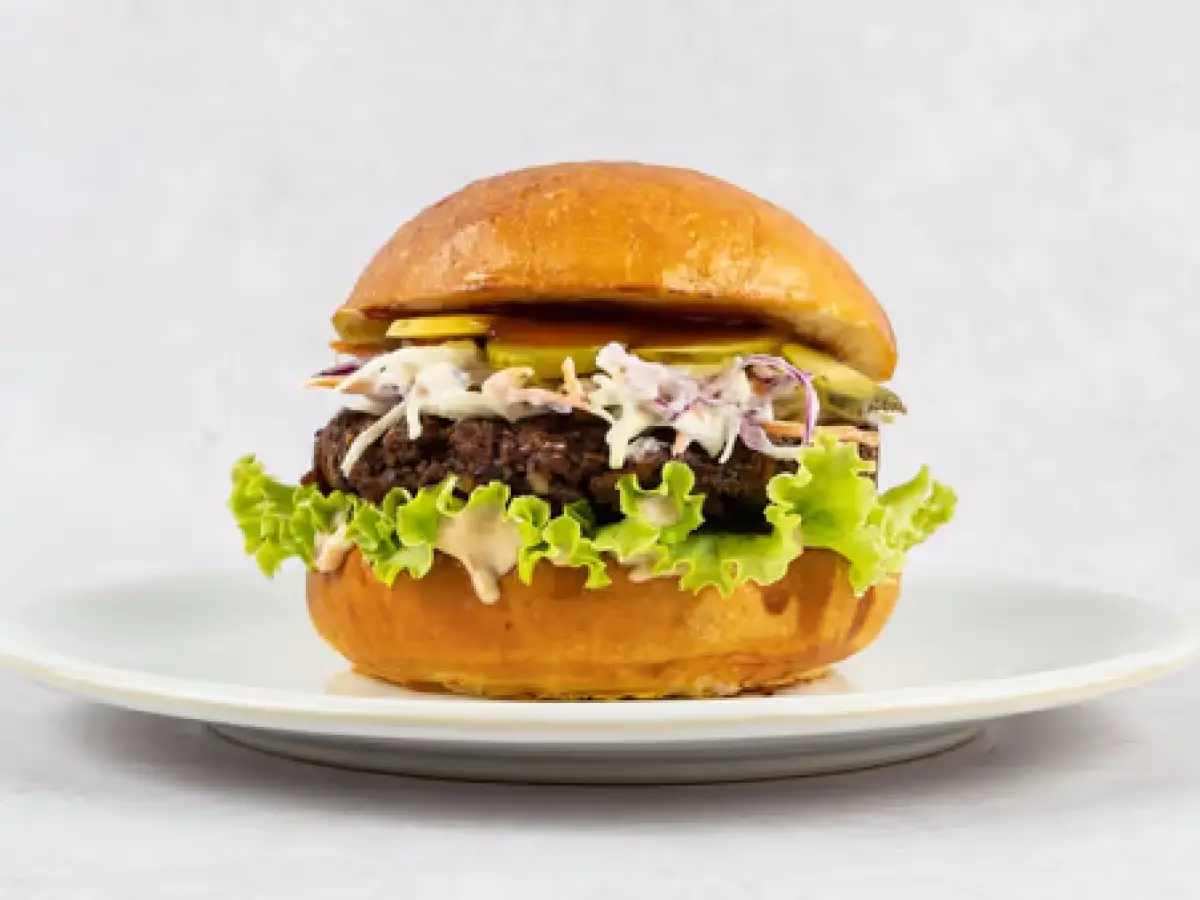 Domaće pecivo, pljeskavica od crnog graha, coleslaw, salata, kiseli krastavci, burger umak
