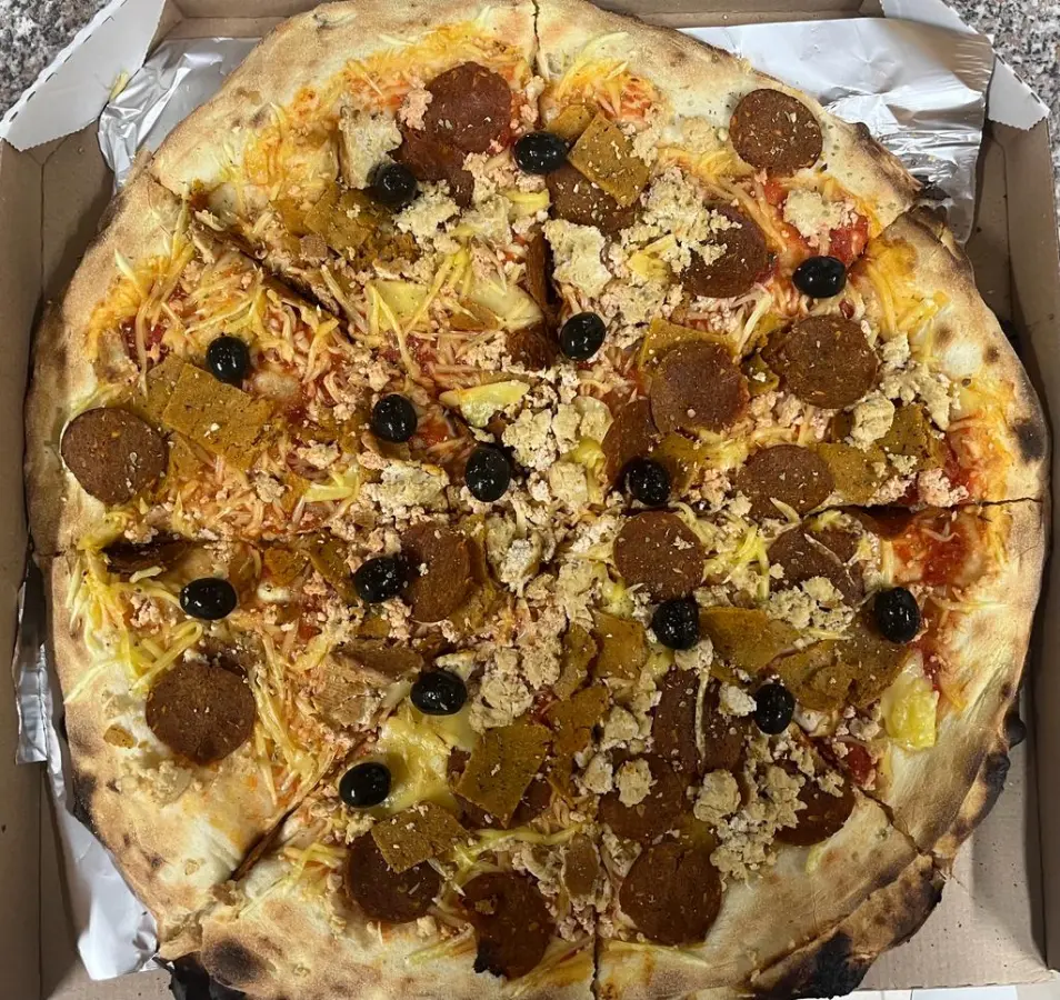Polpa, Violife veganski sir, Primavita veganska mozzarella, svježa paprika, luk, grah, kukuruz, novi sloj tijesta, polpa, Violife veganski sir, dimljeni tofu, seitan kebab, Stellina kobasica, masline i origano.