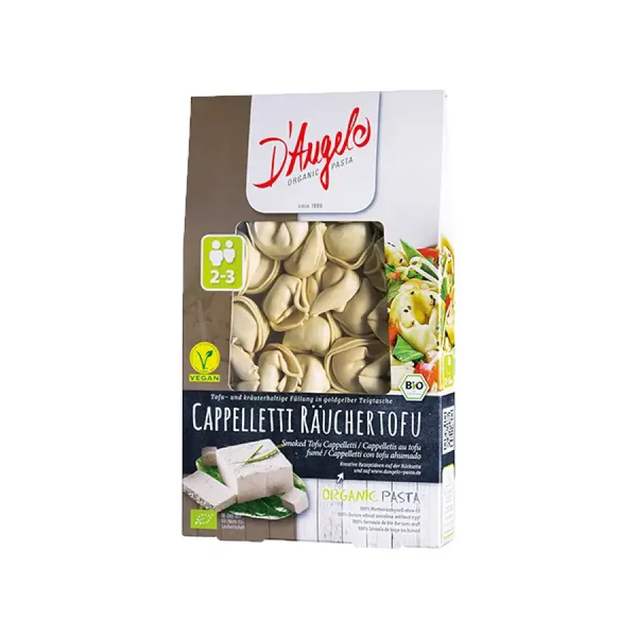 Sastojci: Tijesto za tjesteninu: Durum pšenična krupica*, voda | Punjenje (26 %): dimljeni tofu* (32 %: voda, sojino zrno*, dim), pahuljice krumpira*, krušne mrvice* (meko pšenično brašno*, kvasac*), suncokretovo ulje*, voda, sušeni luk*, morska sol, umak od soje*, (voda, soja*, pšenica*, morska sol, Aspergillus oryzae), emulgator: sojin lecitin*, sušeni poriluk*, origano*, papar*. *iz kontroliranog organskog uzgoja.