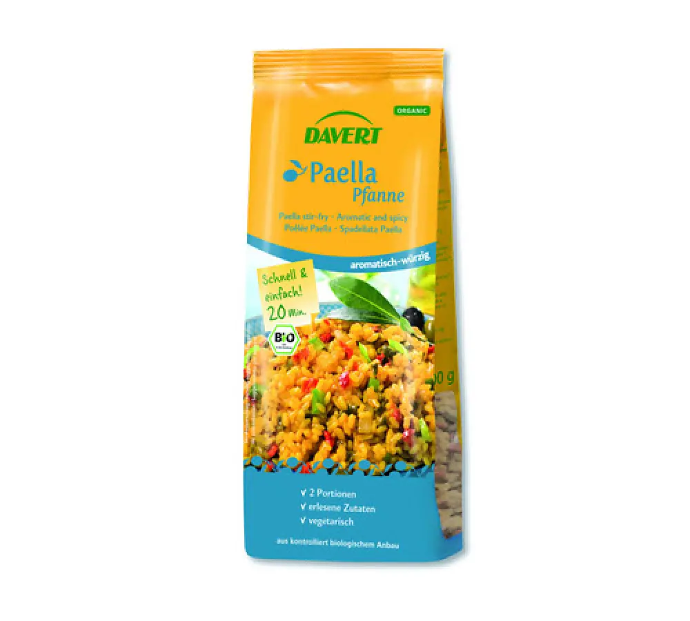 riža glazirana okruglog zrna 77 %, sušeno povrće18 % (zelena paprika, crvena paprika, luk, poriluk), morska sol, granule češnjaka, kurkuma, paprika u prahu, šafran 0,05 %, cimet