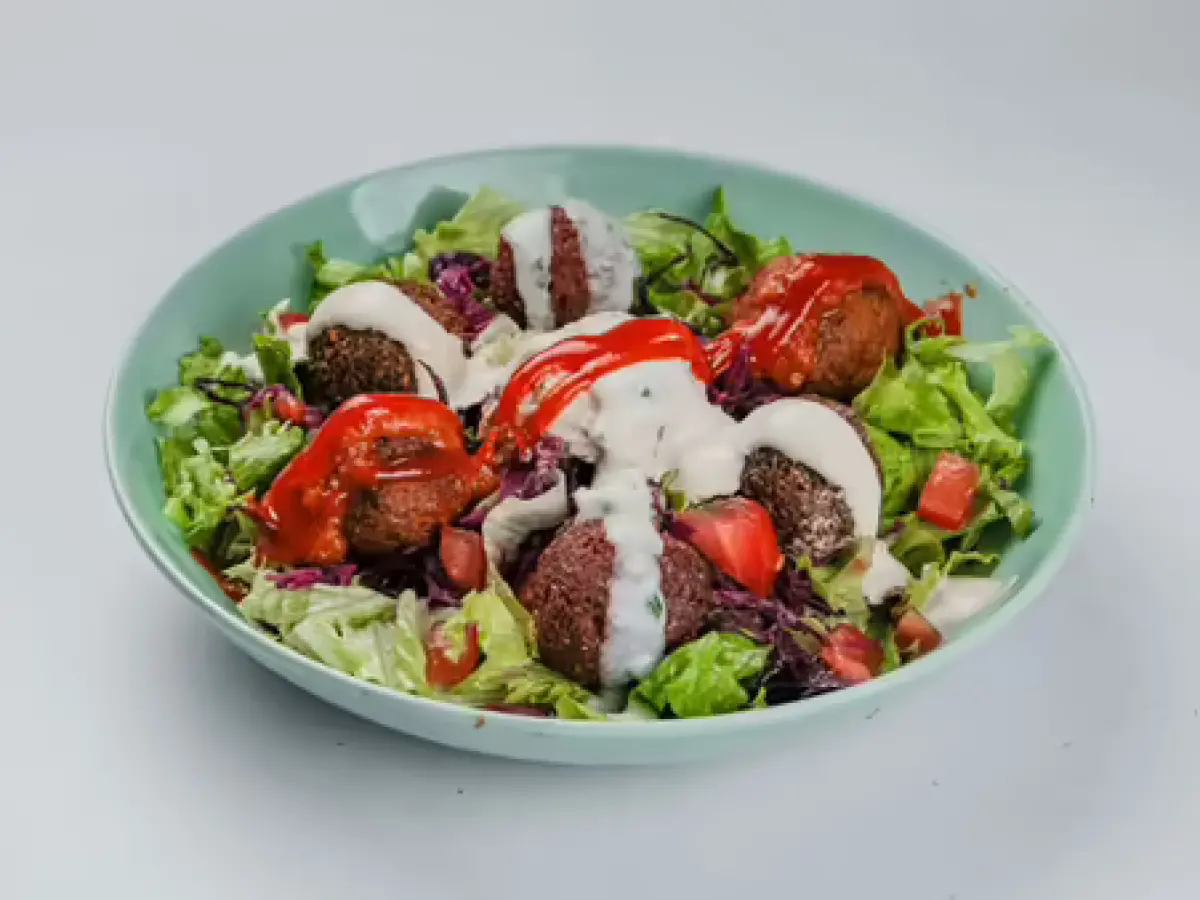 Hummus, mix salata, ukiseljeni crveni kupus, rajčica, kiseli krastavci, dressing, falafel 6 komada po dva od svakog okusa, umaci tahini, soya jogurt vlasac, hot salsa.