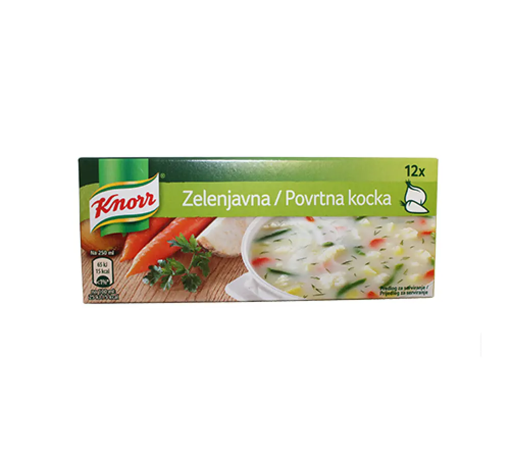 kuhinjska sol, biljna mast (palmina, shea, sal), pojačivači okusa (mononatrijev glutaminat, dinatrijev inozinat, dinatrijev guanilat), škorb, mrkva 2,5 %, kvaščev ekstrakt, celer 2 %, začini (ljupčac, kurkuma, češnjak, papar), luk 1,5 %, šećer, aroma, peršin list 0,3 %, poriluk, bojilo/boja (amonijačni karamel)