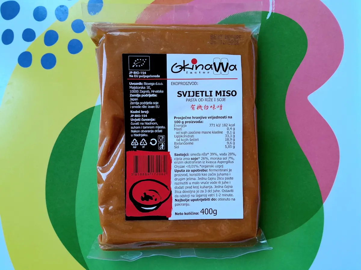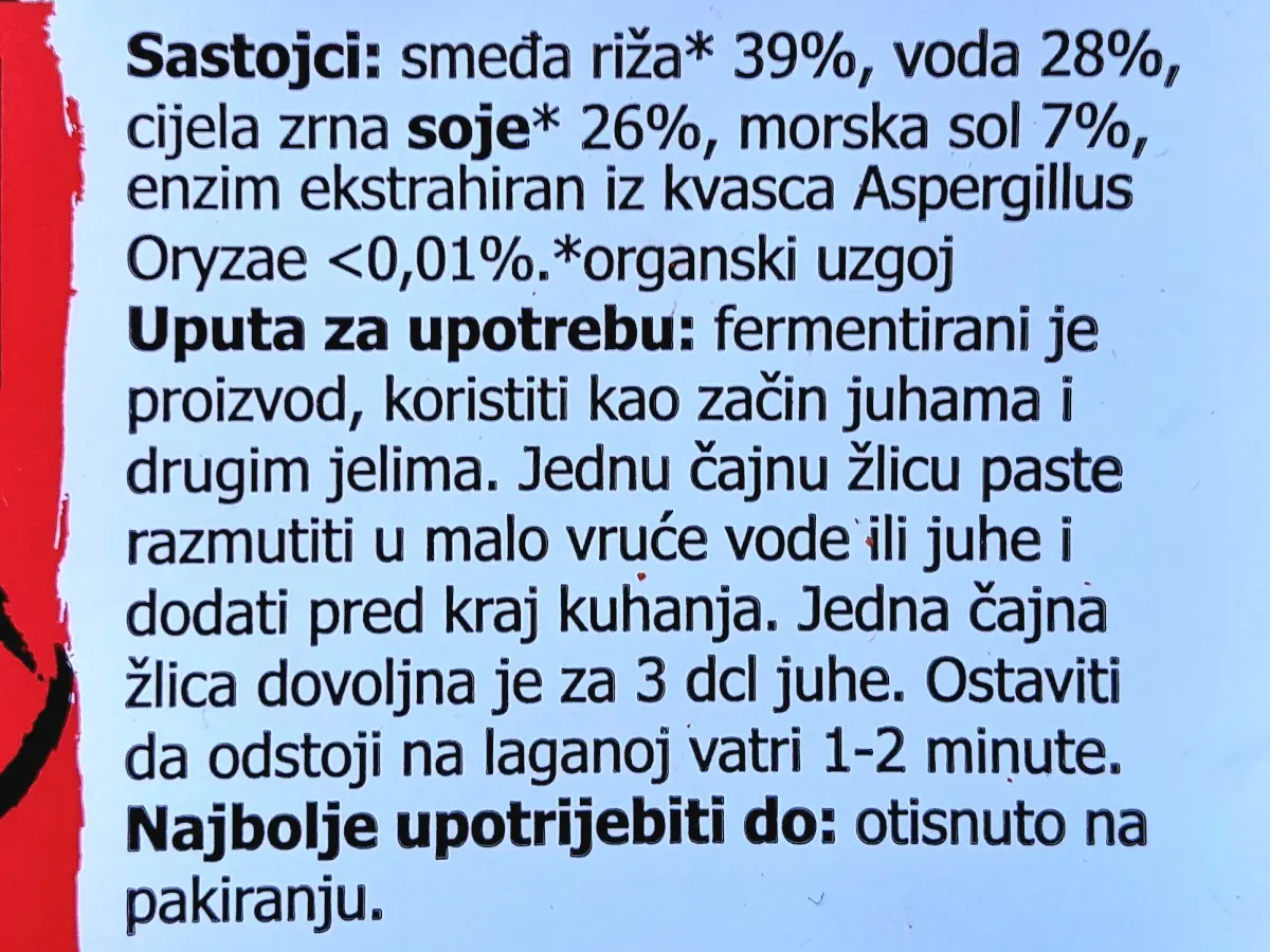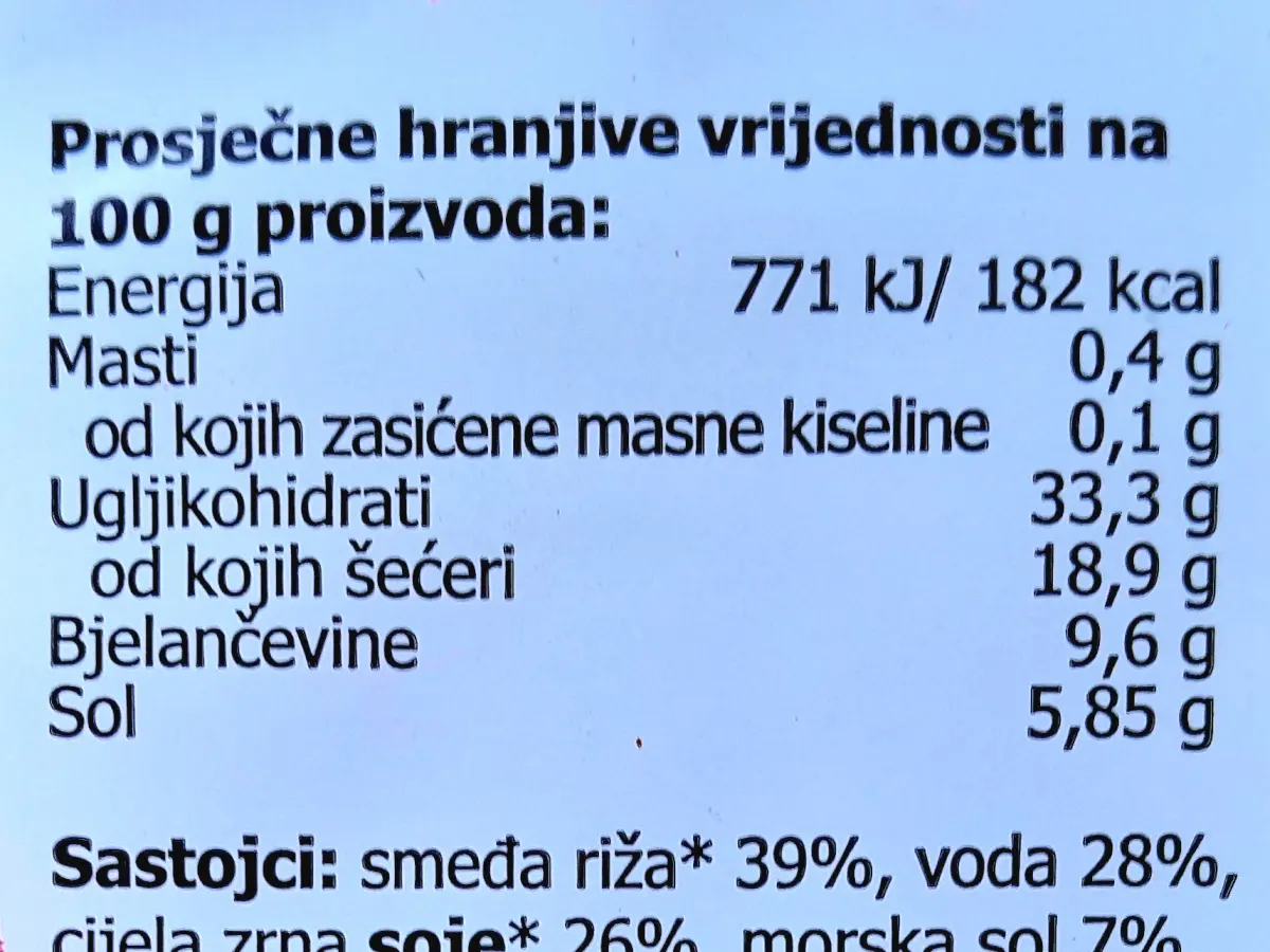 Smeđa riža* 39 %, voda 28 %, zrno soje 26 %, morska sol 7 %, enzim ekstrahiran iz kvasca Aspergillus Oryzae < 0,01 %