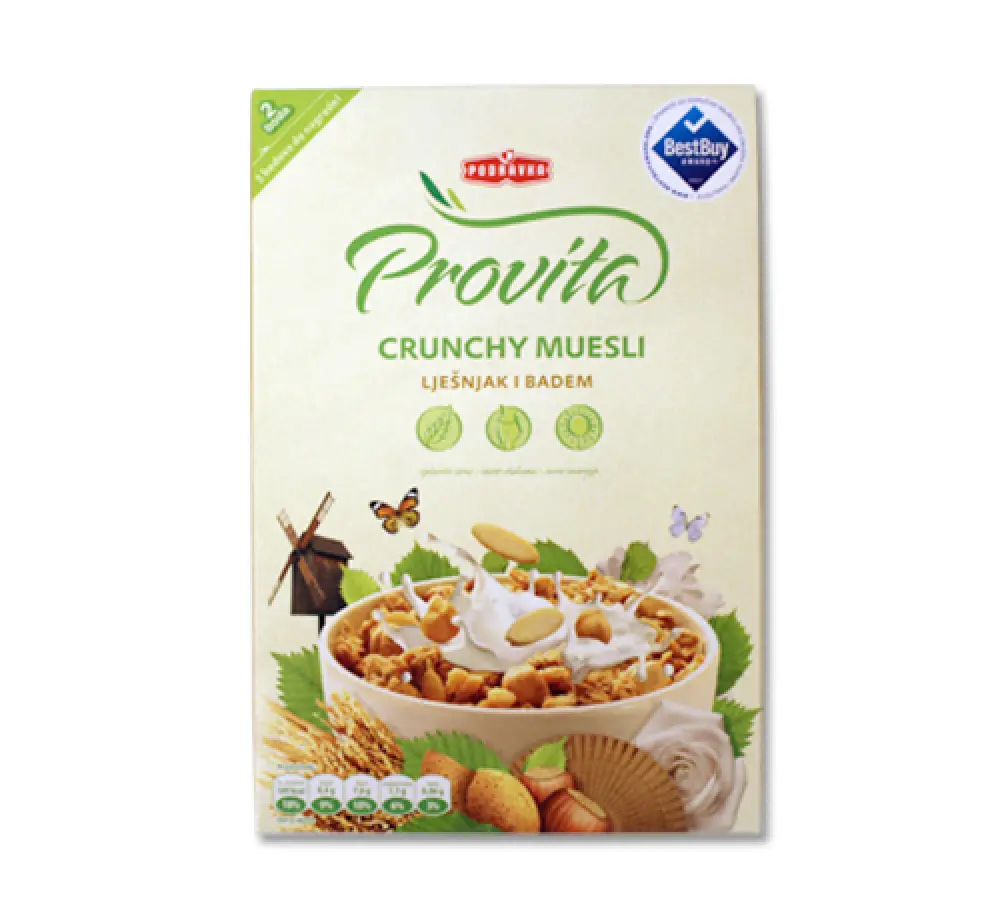 zobene pahuljice 52 %, šećer, pšenično brašno, biljno ulje, hrskave žitarice (kukuruzna krupica, pšenična krupica, regulator kiselosti: natrijev hidrogenkarbonat), lješnjaci 3 %, bademi 3 %, pšenični škrob, kokos, kuhinjska sol, aroma, antioksidansi: askorbil palmitat, mješavina tokoferola, emulgator: sojin lecitin