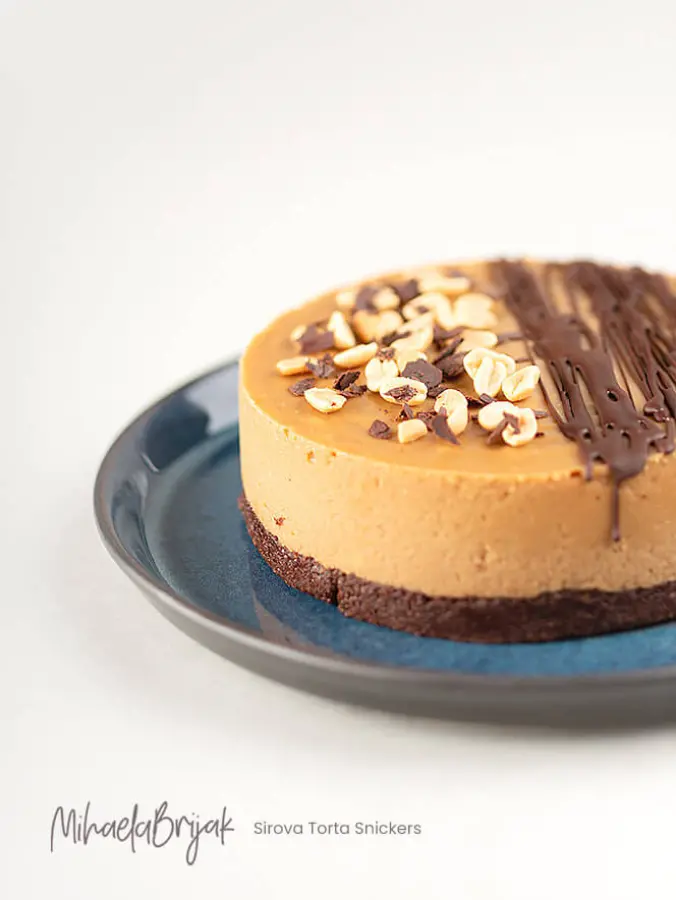 Naša sirova veganska torta 'Snickers', savršena za bilo kojeg fanatika maslaca od kikirikija. Krema punjena kremom od maslaca od kikirikija prelivena sirovom čokoladom, i cijelim kikirikijem, dok je kora napravljan od pravog kakaa.