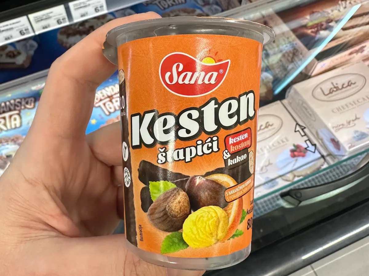55 % kesten pire (kesten, kuhan i očišćen, šećer), 27 % kakao masa [šećer, potpuno hidrogenirana palmina mast, nemasni kakao prah, emulgatori: sojin lecitin, sorbitan tristearat, aroma], margarin (rafinirano suncokretovo i repičino ulje i rafinirano kokosovo i palmino ulje u različitim omjerima), voda, emulgator: mono i digliceridi masnih kiselina; sol, konzervansi: sorbinska kiselina i kalijev sorbat; regulator kiselosti: limunska kiselina; aroma, karoteni].