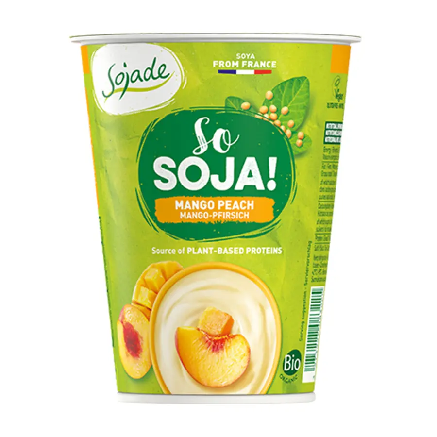 Napitak od soje*(voda, cjelovito zrno soje* 8 %), nerafinirani smeđi šećer od šećerne trske*, pulpa od manga* 6 %, breskva* 3 %, prirodna aroma breskve*, prirodna aroma*, zgušnjivač: pektin, karuba guma, kalcijev citrat, regulator kiselosti: limunska kiselina. Izvorne probiotičke kulture Bifidus i Acidophilus.