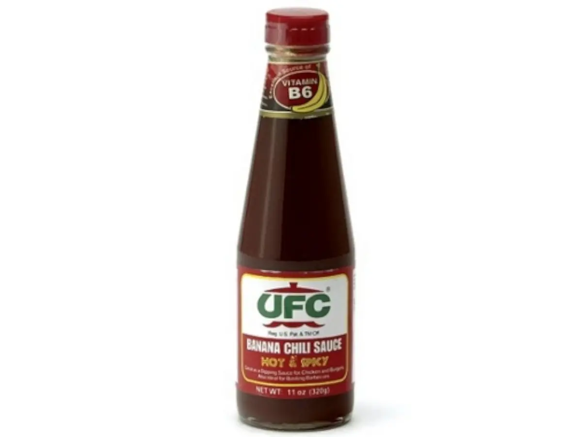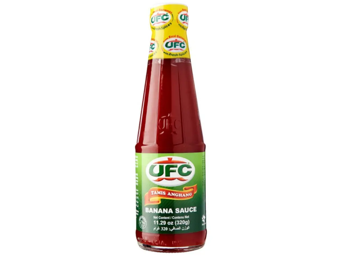 banana 35 %, voda, šećer, ocat, sol, modificirani škrob, luk, začini, sredstvo za konzerviranje: E211, bojilo: E110, E129