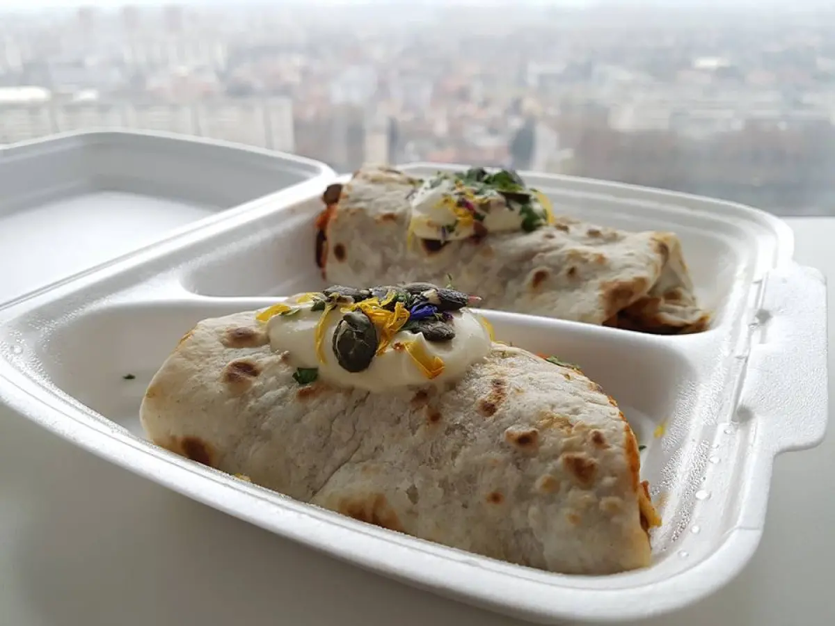 smeđa riža, crveni grah s povrćem i dimljenim tofuom u gustom umaku, sve to lijepo složeno i umotano u veeeliku tortilju i lagano preliveno bijelim umakom