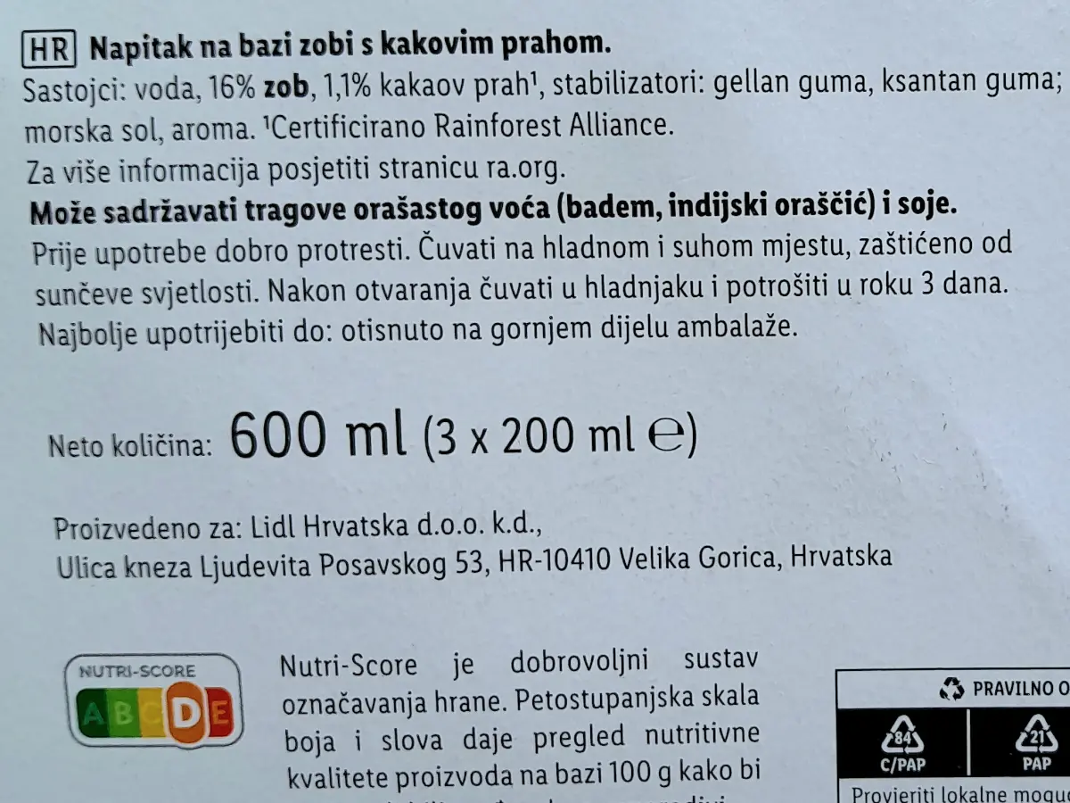 Zobeno mlijeko s kakaom 3 x 2 dl