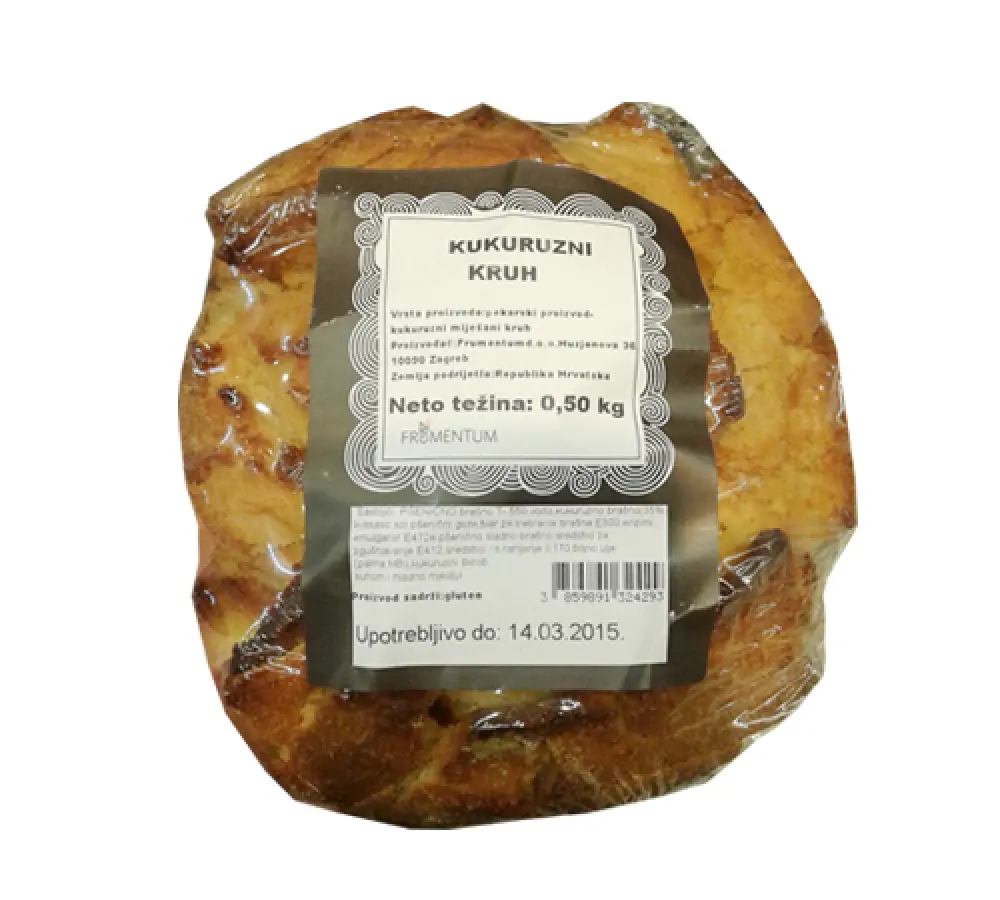 pšenično brašno T-550, voda, kukuruzno brašno 35 %, kvasac, sol, pšenični gluten, tvar za tretiranje brašna E300, enzimi, emulgator E472e, pšenično sladno brašno, sredstvo za zgušnjavanje E412, sredstvo za rahljenje E170, biljno ulje (palmino), kukuruzni škrob