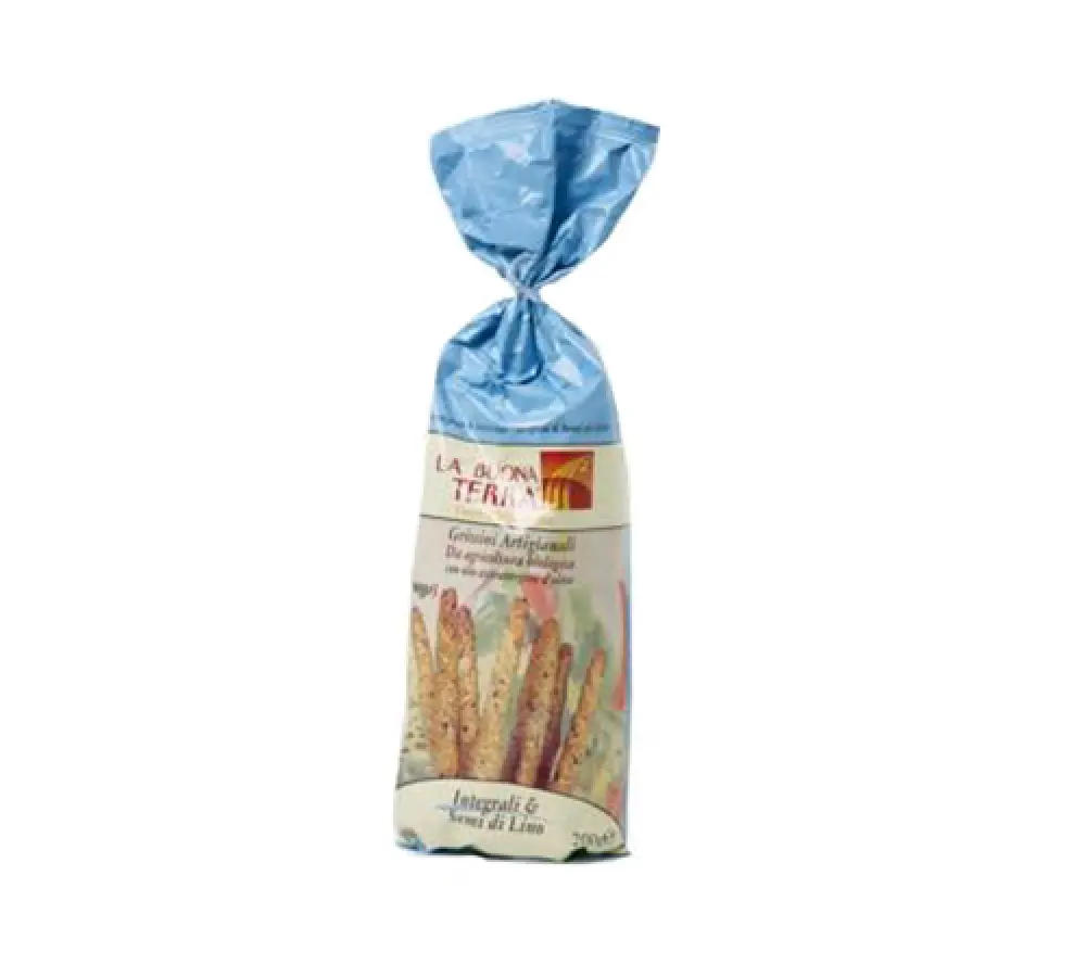 integralno pšenično brašno 80 %, ekstra djevičansko maslinovo ulje 8 %, lanene sjemenke 6 %, kvasac, morska sol