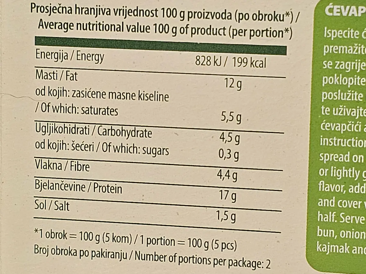 Voda, teksturirani proteini graška 20 %, kokosova mast, repičino ulje, izolat proteina graška 3,7 %, stabilizator (metil celuloza), jodirana sol, maltodekstrin, prirodne arome, emulgator (suncokretov lecitin), koncentrat soka od cikle za boju, ekstrakt jabuke, začini, koncentrirani sok od limuna u prahu, jabučni ocat, dekstroza, ekstrakt začina.