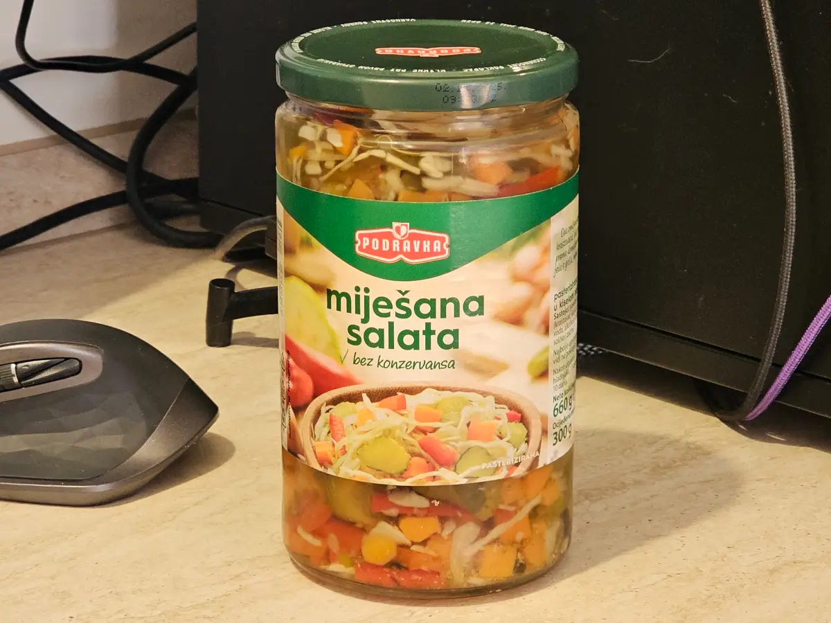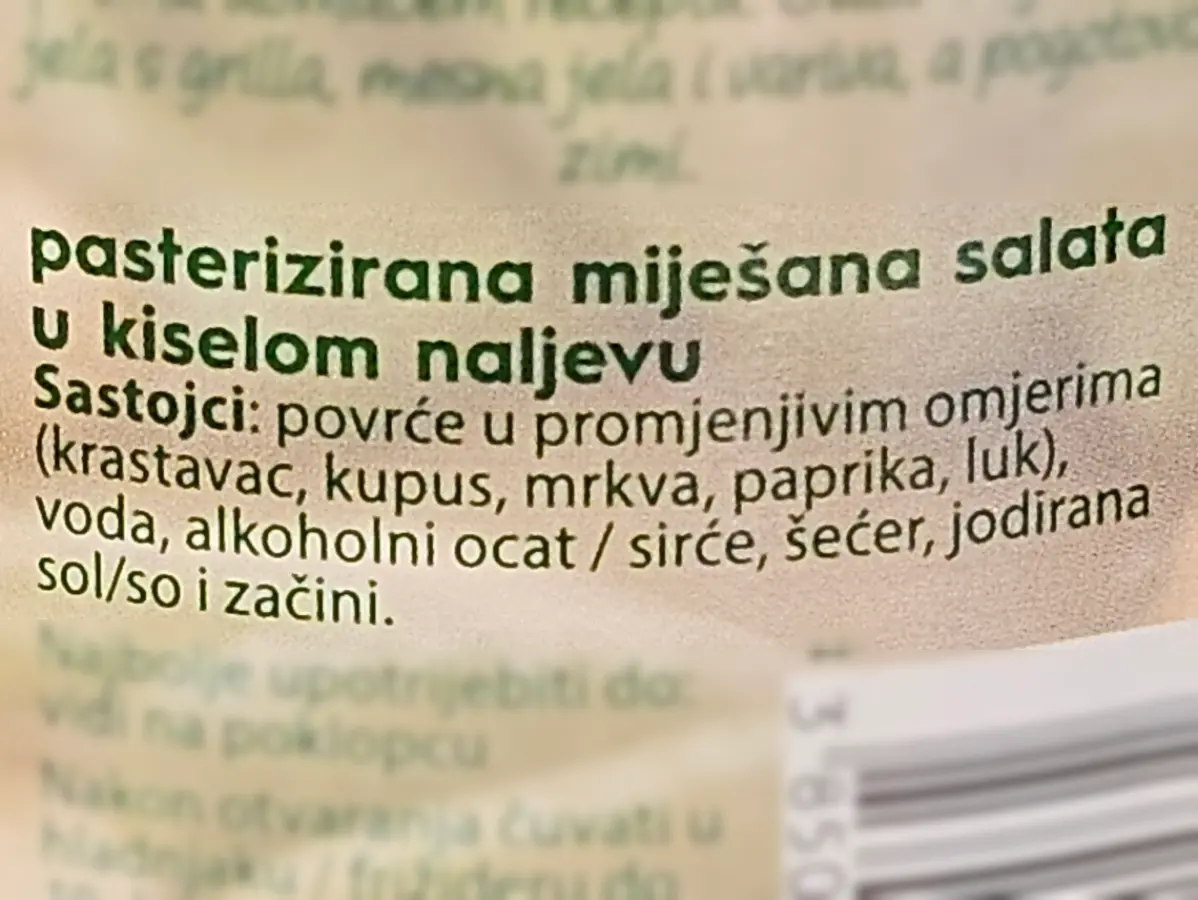 Povrće u promjenjivim omjerima (krastavac, kupus, mrkva, paprika, luk), voda, alkoholni ocat, šećer, jodirana sol i začini.