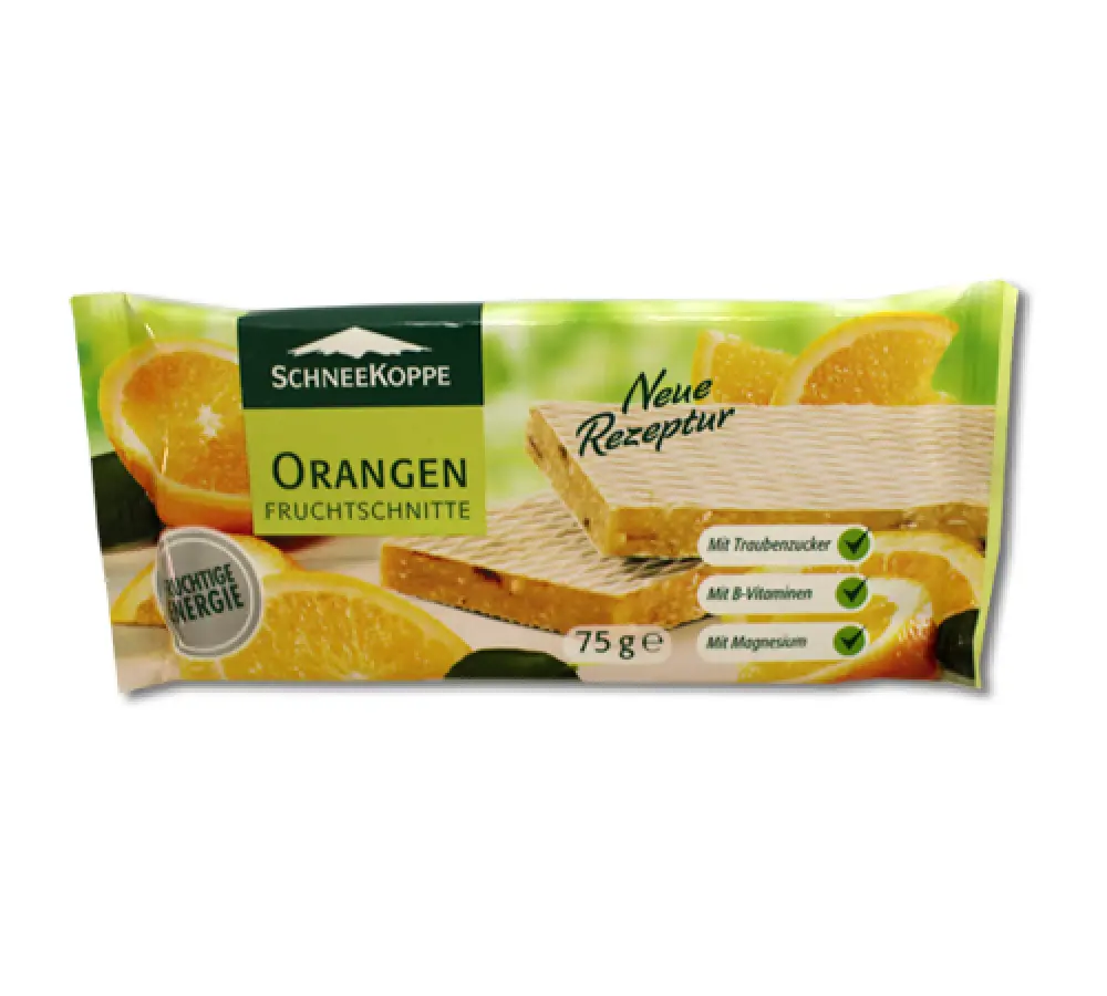 glukozno-fruktozni sirup, sušeni komadići jabuke (jabuka, rižina krupica, kiselina: limunska kiselina, antioksidans: askorbinska kiselina, sol), voćna smjesa naranče (šećer, pire naranče, jabuke, pire ananasa, zgušnjivač: natrijev alginat i maltodekstrin), prepržene žitne pahuljice (zobene pahuljice, pšenične pahuljice), hrskavi komadići riže (rižino brašno, šećer, pšenični gluten, brašno ječmenog slada, sol), masnoće kokosa, koncentrat soka naranče, oblatne (škrob, omekšana biljna ulja), kiselina: limunska kiselina, magnezijev karbonat, aroma, vitamin B1, vitamin B2, vitamin B6