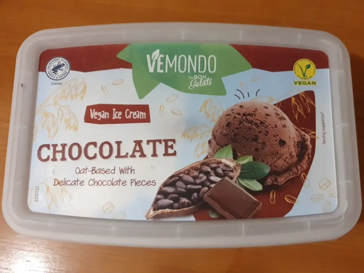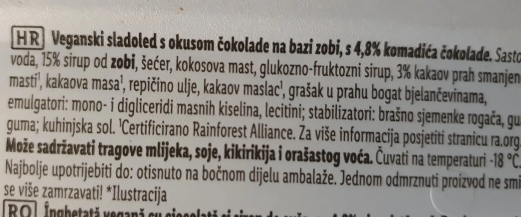 Veganski sladoled s okusom čokolade na bazi zobi s 4,8 % komadića čokolade.