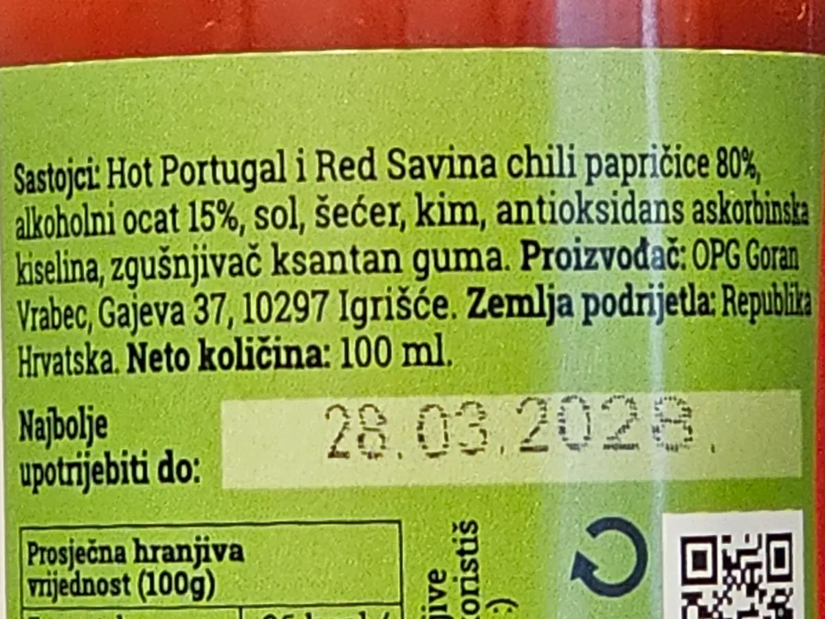 Hot Portugal i Red Savina chili 80%, alkoholni ocat 15%, sol, šećer, češnjak, začini, antioksidans askorbinska kiselina, zgušnjivač ksantan guma.