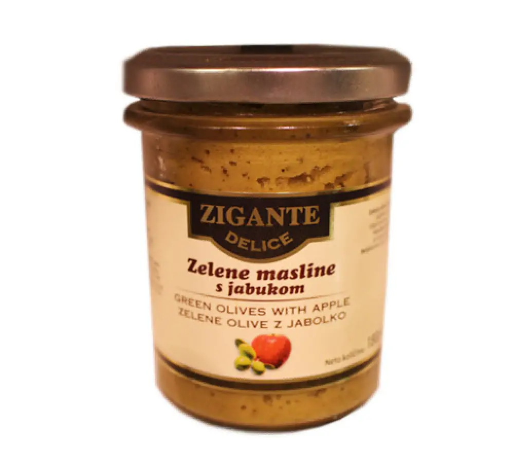 zelene masline 59 %, jabuka 24 %, ekstra djevičansko maslinovo ulje, začini