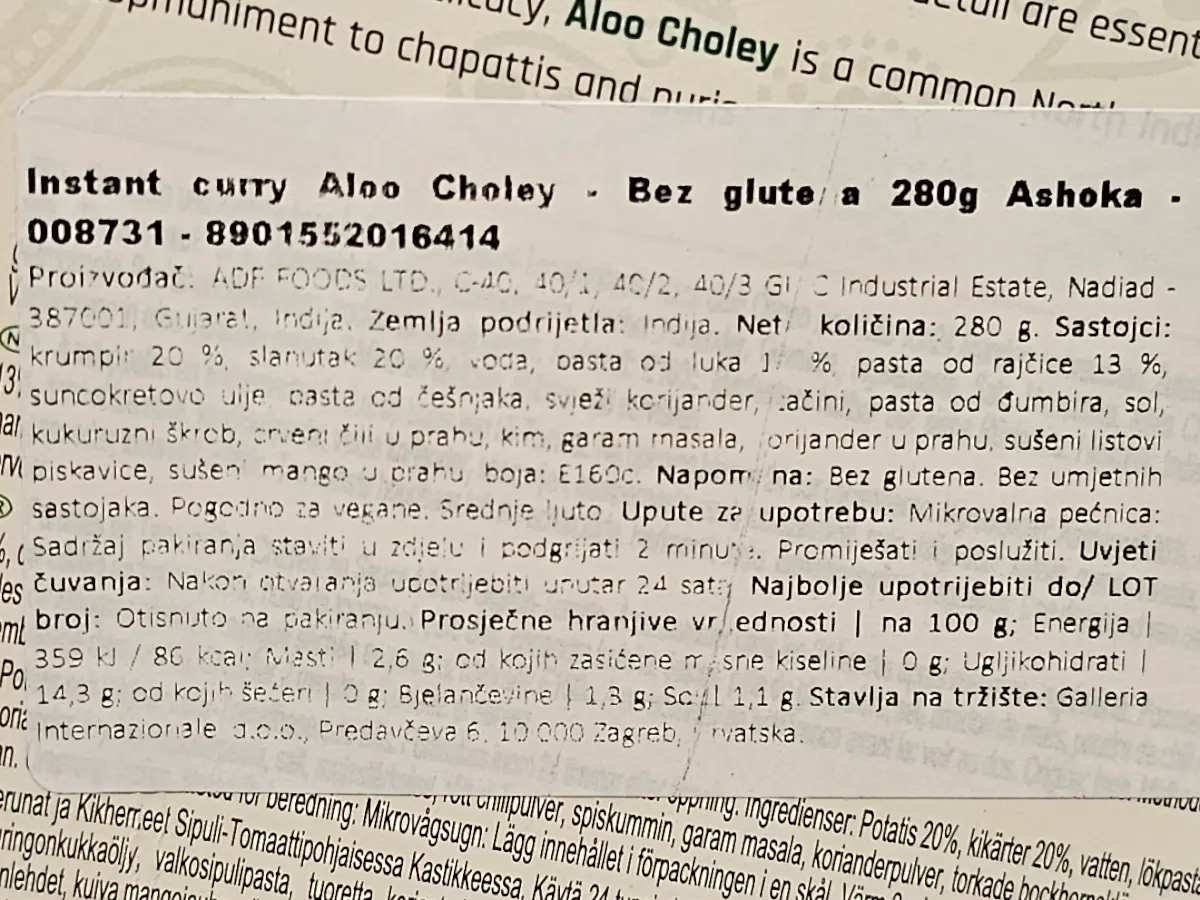 Krumpir 20 %, slanutak 20 %, voda, pasta od luka 16 %, pasta od rajčice 13 %, suncokretovo ulje, pasta od češnjaka, svježi korijander, začini, pasta od đumbira, sol, kukuruzni škrob, crveni čili u prahu, kim, garam masala, korijander u prahu, sušeni listovi piskavice, sušeni mango u prahu, boja: E160c.