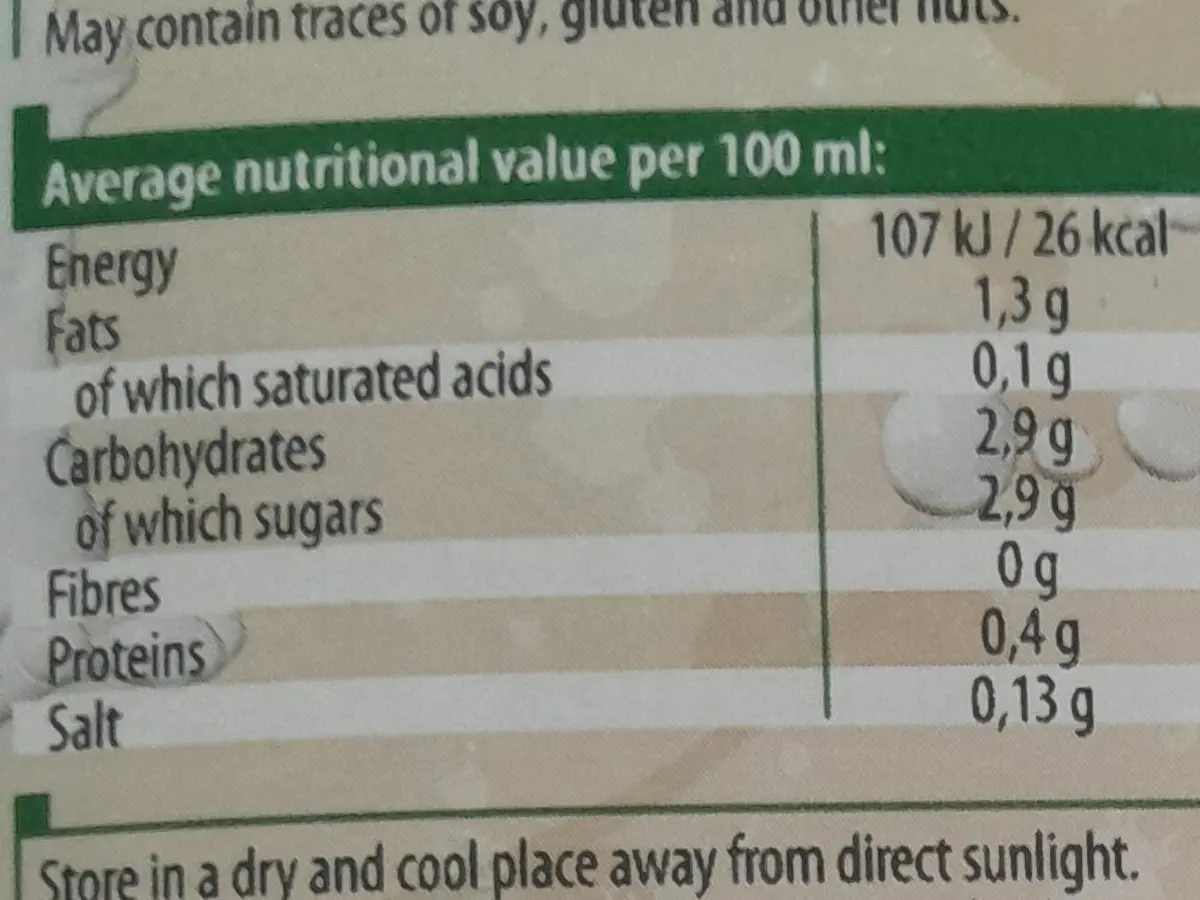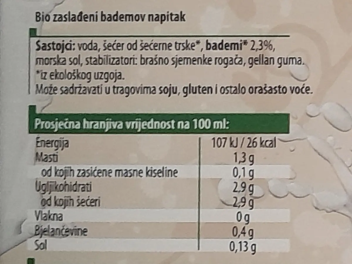 Voda, šećer od šećerne trske*, bademi* 2,3 %, morska sol, stabilizatori: brašno sjemenke rogača, gellan guma.
