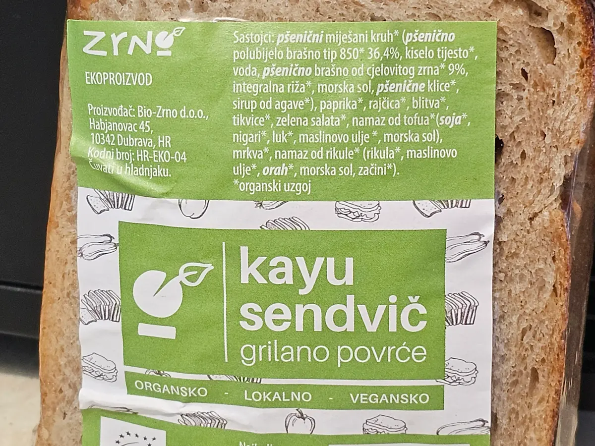 Pšenični miješani kruh* (pšenično polubijelo brašno tip 850* 36,4 %, kiselo tijesto*, voda, pšenično brašno od cjelovitog zrna* 9 %, integralna riža*, morska sol, pšenične klice*, sirup od agave*), paprika*, rajčica*, blitva*, tikvice*, zelena salata*, namaz od tofua* (soja*, nigari*, luk*, maslinovo ulje *, morska sol), mrkva*, namaz od rikule* (rikula*, maslinovo ulje*, orah*, morska sol, začini*).