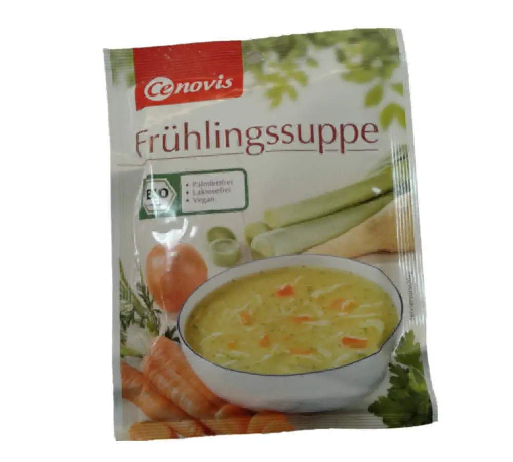tjestenina (griz durum pšenice) 66,7 %, morska sol, krumpirov škrob, mrkva, luk, ekstrakt kvasca, palmino ulje, sirovi šećer, poriluk, peršin, kurkuma, pastrnjak