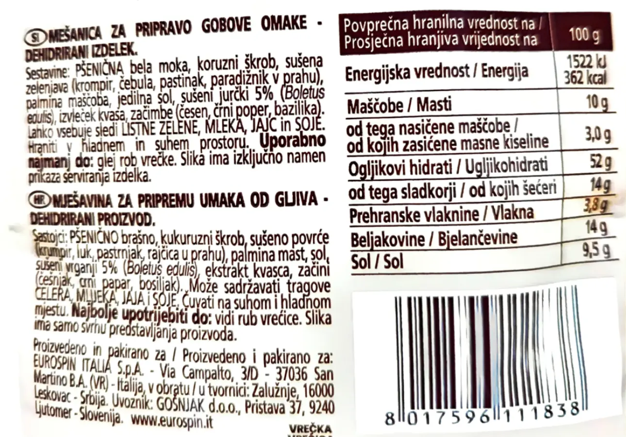 Pšenično brašno, kukuruzni škrob, sušeno povrće (krumpir, luk, pastrnjak, rajčica u prahu), palmina mast, sol, sušeni vrganji 5 %, ekstrakt kvasca, začini (češnjak, crni papar, bosiljak).