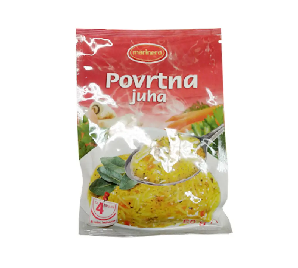 koncentrat za juhu (kuhinjska sol, mješavina sušenog povrća u promjenjivim omjerima 20 %: mrkva, korijen celera, krumpir, luk, poriluk, paprika), kukuruzni škorb, pojačivaći arome: mononatijrev glutaminat, dinatriejvi 5' ribonukleotidi; palmina mast, šećer, maltodekstrin, hidrolizat biljnih bjelančevina soje, začini: peršin list, kurkuma, papar; bojila: riboflavin, obični karamel; tjestenina 42 % (pšenična krupica, voda, kuhinjska sol)