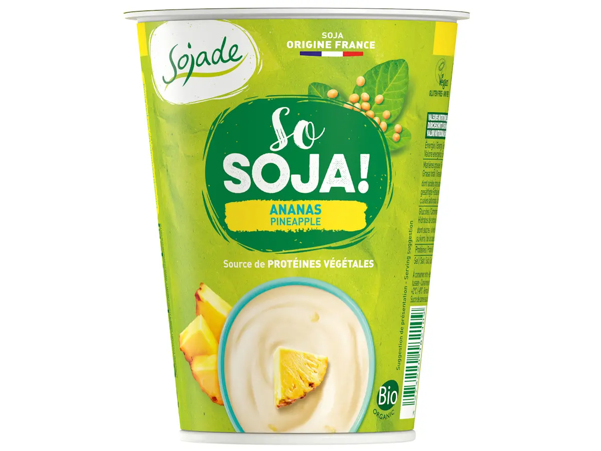 Napitak od soje* (izvorska voda, cjelovito zrno soje*8 %), ananas* 10 %, nerafinirani smeđi šećer od šećerne trske*, sirup od žitarica*, prirodna aroma ananasa*, zgušnjivač: pektin, karuba guma, kalcijev citrat, regulator kiselosti: limunska kiselina, izvorne probiotičke kulture Bifidus i Acidophilus.