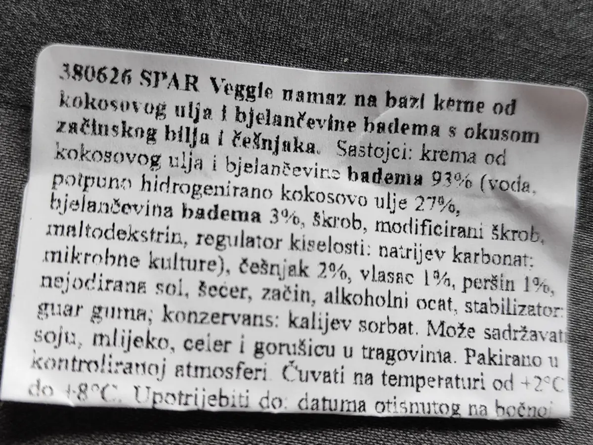 Namaz na bazi kreme od kokosovog ulja i bjelančevina badema s okusom začinskog bilja i češnjaka.