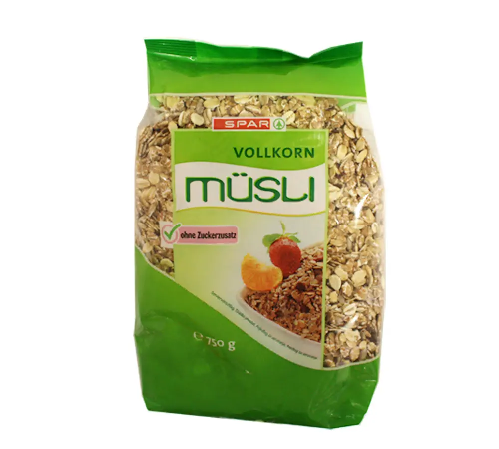 pšenične pahuljice iz cjelovitog zrna (35 %), zobene pahuljice iz cjelovitog zrna (15 %), ražene pahuljice iz cjelovitog zrna (12 %), grožđice (12 %), ječmene pahuljice iz cjelovitog zrna (9 %), laneno sjemenje (9 %), sjemenke suncokreta (8 %)