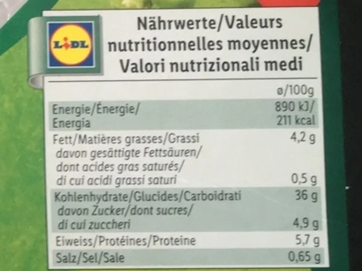 NUTRITIONAL VALUES100 gEnergy (Calories / kCal) 211.0 kCalEnergy 890.0 kJFat 4.2 gSugars 4.9 gSaturated fat 0.5 gCarbohydrates 36.0 gProtein 5.7 gSalt 0.65 g