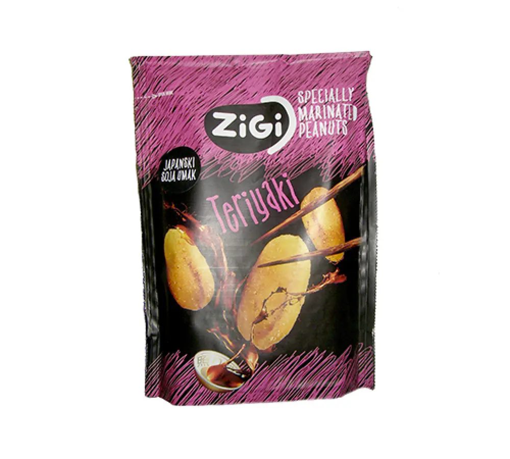 kikiriki, biljno ulje, sol, šećer, aroma terijakija 3 % (natrijev glutaminat, soja sos u prahu 5 %, maltodekstrin, češnjak, začini, aroma dima), dekstrin, sorbitol, modificirani škrobProizvod sadrži gluten, soju, celer i kikiriki
