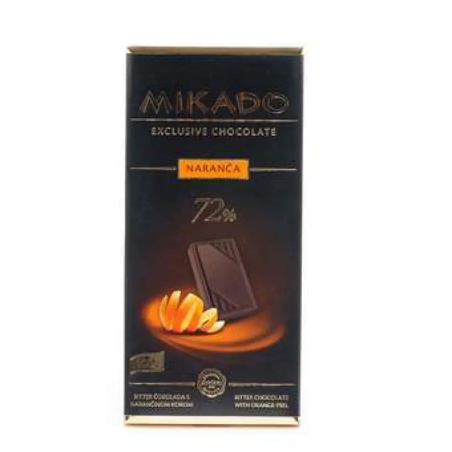 Kakaova masa, šećer, kandirana narančina kora 15 % (narančina korica, šećer, glukozno- fruktozni sirup, regulator kiselosti E330), kakaov maslac, kakaov prah smanjene masti, emulgatori (soja lecitin, E476), prirodna aroma vanilije. Kakaovi dijelovi 72 % min